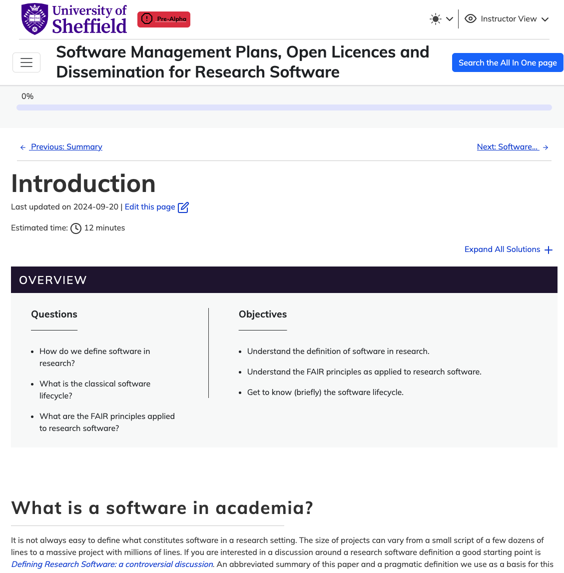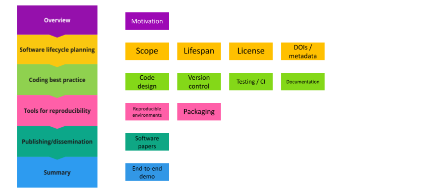 When you start writing software it is often very useful to think about the development process and how you will make your software sustainable in the long term. In this module we will introduce important aspects of software development in research: software management plan, licences and dissemination. This module should allow you to ask yourself the right questions when starting a research software project.