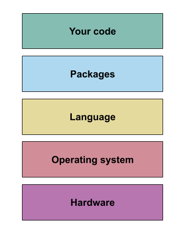 A simplified way to think about your computational environment is to divide it into 5 layers, each with increasing generality: