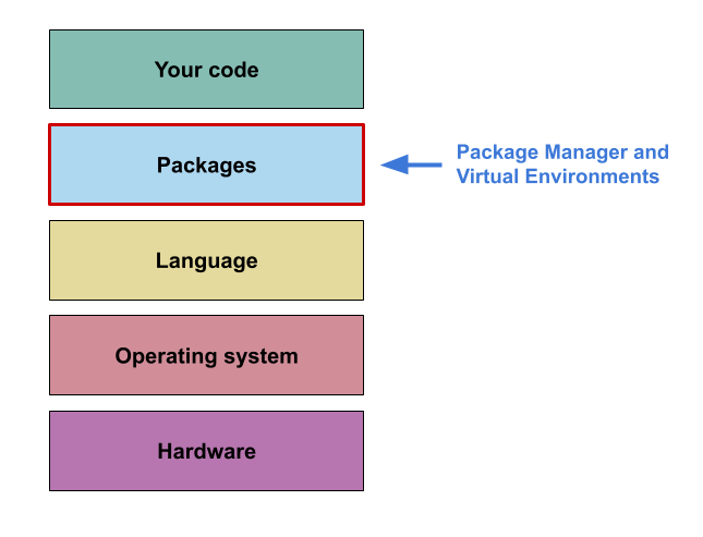 If we go back to our diagram showing the different layers of your computational environment, you can see that virtual environments only address the layer of the environment immediately below your code.